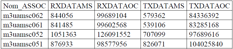 Dans le cas de la couche d’adaptation M3UA, la Sonatel l’utilise pour la configuration des liens SIGTRAN des PTS vers les différents noeuds du coeur réseau NGN. Nous avons mis en évidence des exemples concrets dans ce tableau pour justifier les théories déjà vues dans les cours. Il a été dit dans le paragraphe II.2.1 que la couche d’adaptation M3UA assure l’acheminement de messages ISUP ou SCCP entre un SG et un MGC en fournissant une interface MTP3 à la couche supérieure (ISUP, SCCP). C’est dans le même sens que la configuration a été effectuée, par exemple sur les liens d’association des MSoft X3000 (MSC NGN) et les STP. Voici l’interprétation du tableau suivant issue des études et analyses effectué après l’observation de ces liens. La première colonne indique le nom d’association du lien et les autres paramètres sont exprimés dans l’annexe B. Il est à noter qu’une association se réfère à une association SCTP. L’association fournit le transport pour des unités de données de protocole (SCTP du terminal local et SCTP du terminal distant) et des messages de couche d’adaptation paire (M3UA du terminal locale et M3UA du terminal distant). Par exemple, le paramètre (RXDATAMS) représente le nombre de messages de données reçus par le STP de l’ASP (Application Service Part) dans la couche M3UA, ici c’est les MSC06 et MSC05 qui sont les ASPs.