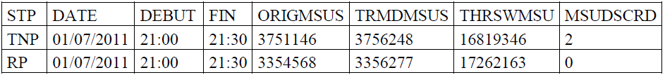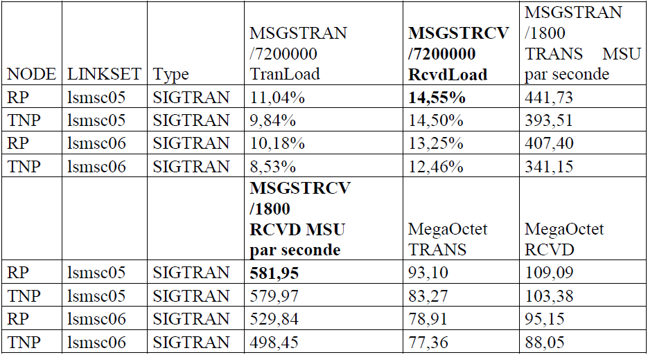 Les indicateurs de ce tableau sont expliqués dans l’annexe B. Nous pouvons noter que les valeurs de ces compteurs sont les MSU de l’ISUP échangé entre les PTS les différents noeuds destinataire exprimé en nombre de message et en Octet associé aux messages envoyés sur ces liens.