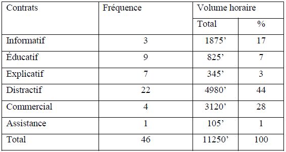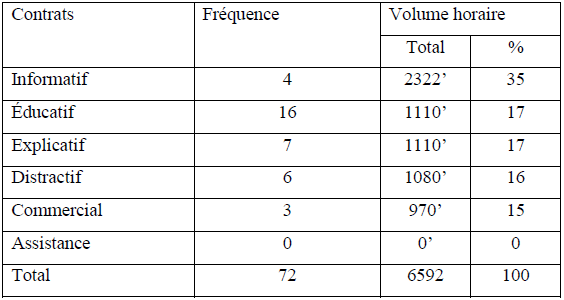 De ce tableau découlent les résultats suivants : d’une part, le total des fréquences montre 46 apparitions. Le contrat informatif en montre 3, 11 pour le contrat éducatif, le contrat explicatif 6, 21 pour le contrat distractif, le contrat commercial 4, enfin 1 pour le contrat d’assistance. Tandis que le volume horaire donne un total de 11250 minutes.
