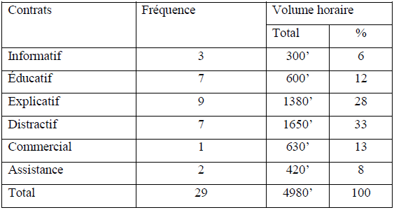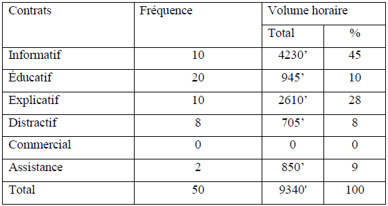 Il ressort de ce tableau un total de fréquence d’apparition de 50, dont 10, pour le contrat informatif, 20 le contrat éducatif, 10 le contrat explicatif, 8 le contrat distractif, 0 le contrat commercial, enfin 2 pour le contrat d’assistance. Tandis que les volumes horaires font au total 9340 minutes (100%), avec 4230 minutes, soit 45% pour le contrat informatif, 945 minutes, soit 10% le contrat éducatif, 2610 minutes, soit 28% le contrat explicatif, 705 minutes, soit 8% le contrat distractif, 0 ou 0% le contrat commercial, et 850 minutes, soit 9% pour le contrat d’assistance.