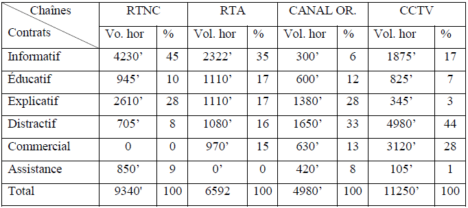L’objectif est d’extraire les éléments comparatifs des résultats issus de l’analyse des grilles respectives des chaînes de télévision. Nous retenons les résultats des volumes horaires dans le tableau suivant :