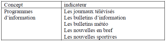 A cette étape, la procédure est double. Dans un premier temps nous allons opérationnaliser les types de programmes, selon la classification de ELITE(63), que nous regroupons en contrats médiatiques énoncés par Soulage et Lochard auxquels ELITE a ajouté le contrat phatique (contact avec le public). Et dans un second temps, nous allons, d’une part déterminer les types de programmes dans chaque grille, et d’autre part, dégager les fréquences de chaque type dans la grille ainsi que le volume horaire consacré à chaque type.