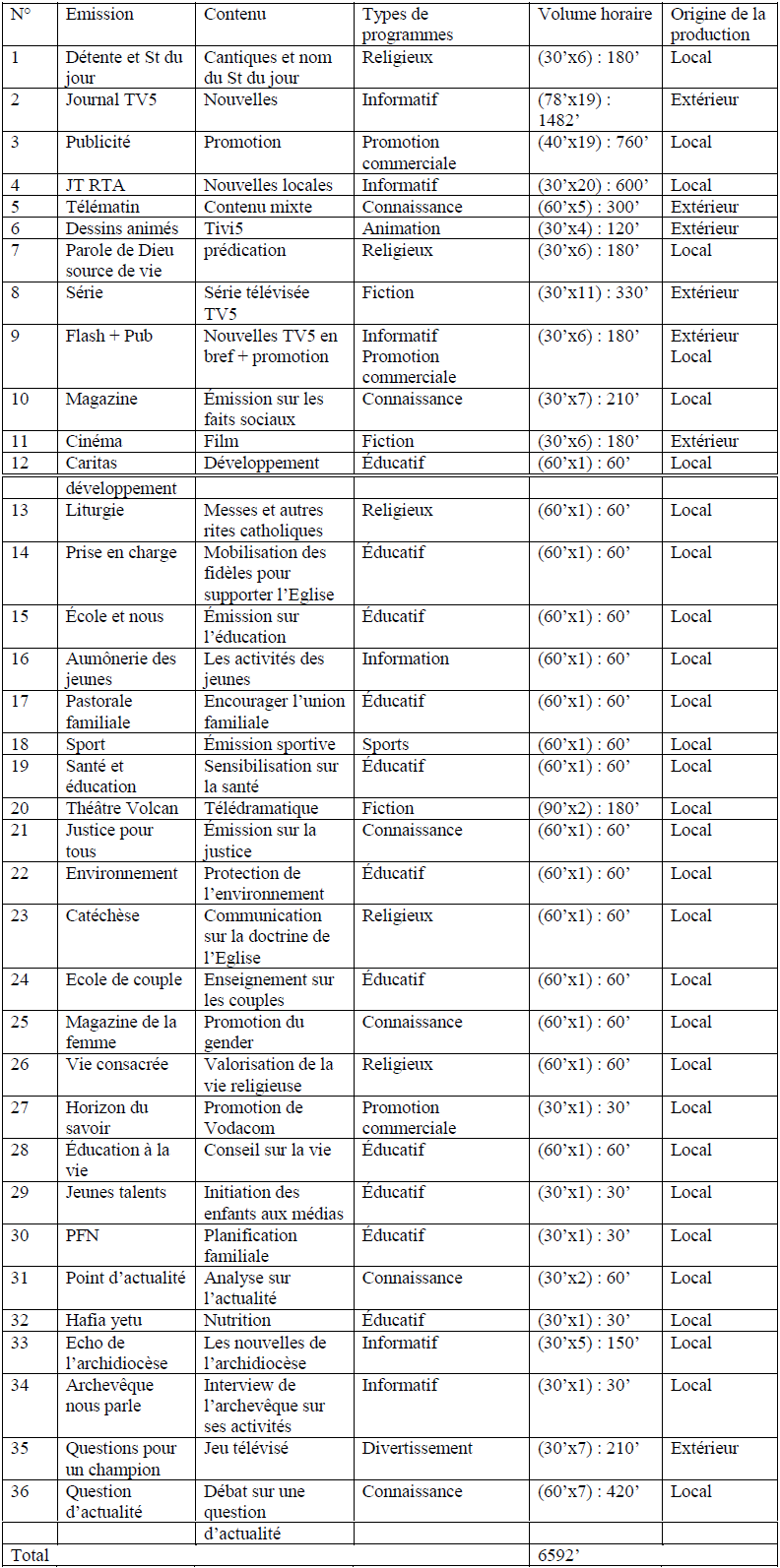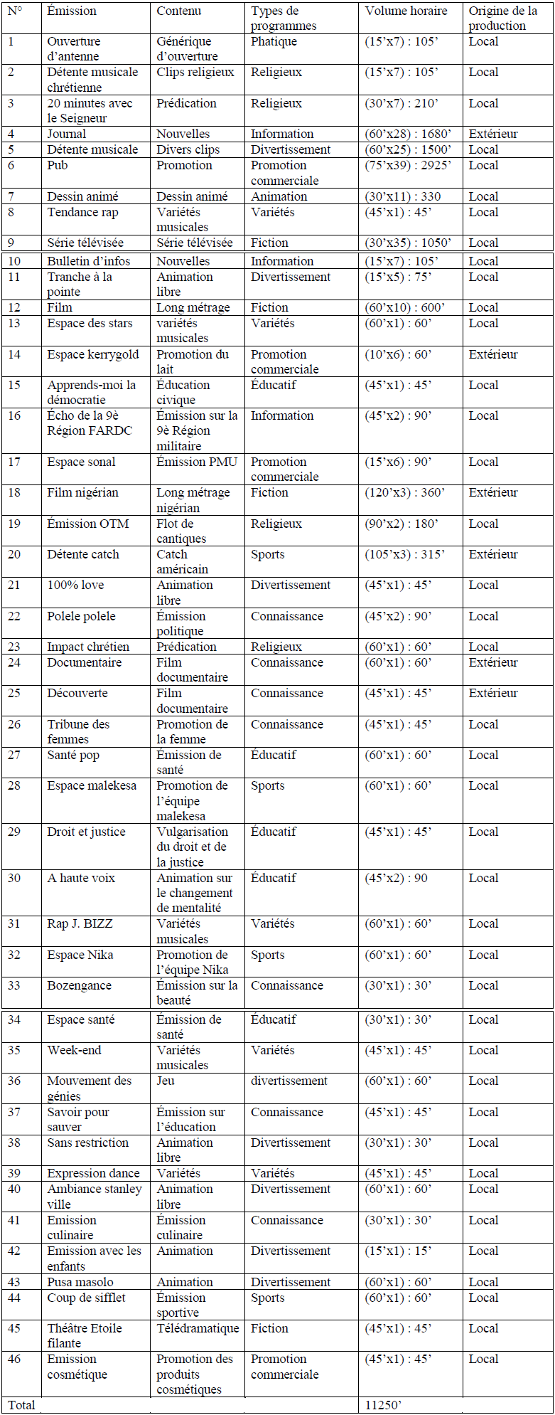 Il ressort de ce tableau que la grille de la RTNC/station provinciale comporte dans sa grille hebdomadaire un total de 51 émissions avec 9340 minutes de volume horaire.