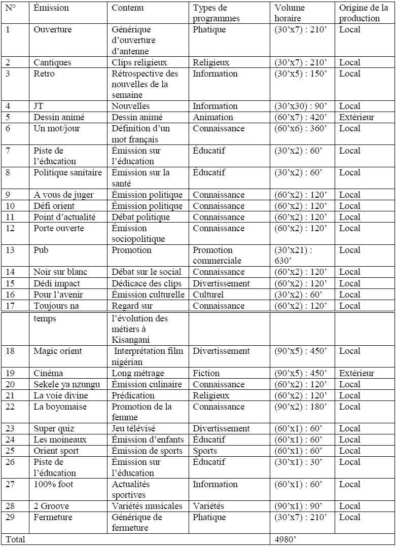 Nous effectuons cette dissection sur base d’un corpus composé de grilles des programmes de quatre chaînes de télévision émettant de Kisangani. Il s’agit de la grille de programmes de la RTNC/station provinciale (datant de plusieurs années), la grille de RTA/Télévision (révisée en 2010), la grille de Canal orient (élaborée en 2011) et la grille de CCTV (en élaboration)(61).