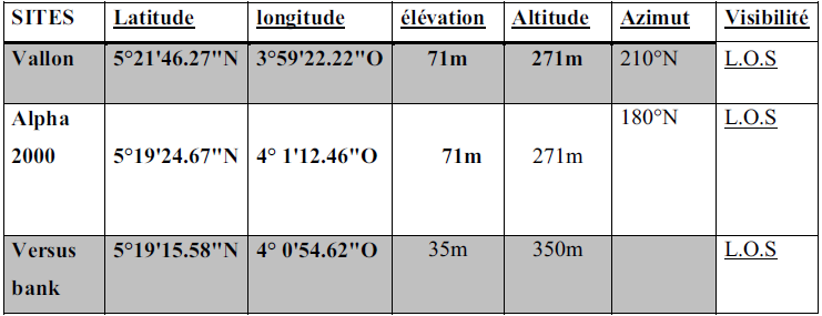 Ainsi nous avons pu avoir sites par sites les informations telle que recueillies dans le tableau suivant :( Voir aussi en Annexe1 avec la fiche de Survey). Ces emplacements respectent les coordonnées suivantes qui nous seront fort utile dans la suite de nos travaux.
