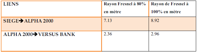 Ces résultats donnants la valeur du rayon de FRESNEL à 80% et à 100% de la distance totale des liens radio ; signifient que pour les liaisons :