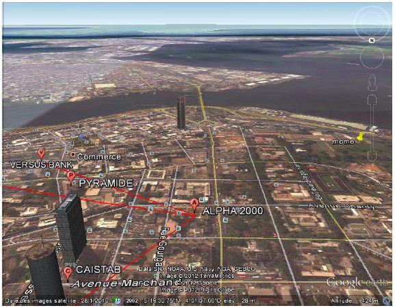 Dans notre cas de figure, ne disposant pas de Récepteur GPS à notre disposition nous nous sommes baser sur un logiciel open Source jouant parfaitement le rôle de notre récepteur GPS (de Google Earth dans sa version 6.2.1.6014), et sur des visites sur terrain (avec Jumelles et boussoles) pour s’assurer d’une visibilité parfaite entre les liens.