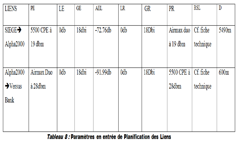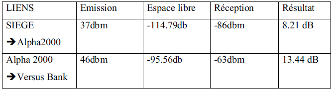 Dans notre cas de figure sont définies une Marge de 8.21 dB pour le premier lien (SIEGE -> ALPHA2000) et 13.44dB pour le second lien (ALPHA 2000 -> VERSUS BANK).