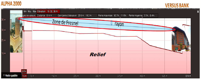 ALPHA2000-VERSUS BANK fixée à 600 M en termes de distance totale, nous ne devrons pas avoir d’obstacles majeur dans la zone ayant un rayon de2 .36m pour une distance de 480m depuis le point d’émission (Rayon de Fresnel à 80%) et un rayon de 2.96m pour une distance de 600m depuis le point d’émission (Rayon de Fresnel à 100%).