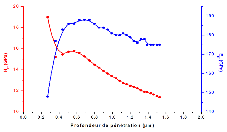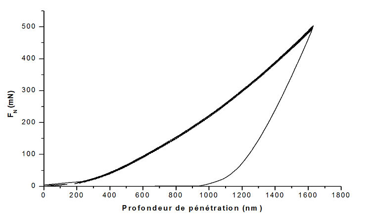 L’indentation à force imposée, réalisée par le nanoindenteur NHT, fournit des mesures avec une dispersion convenable pour l’identification des caractéristiques du revêtement par rapport aux celles du substrat. Toutefois, elle présente parfois des irrégularités de mesures à cause de l’apparition du phénomène pop-in qui est liée à la charge imposée par l’indenteur et le comportement du matériau indenté.