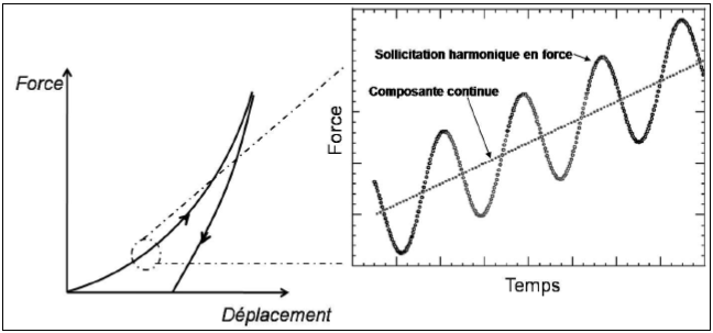Dans cette configuration de nanoindentation l’indenteur est soumis à une charge sinusoïdale de pulsation constante lors de son enfoncement dans l’échantillon. Donc plusieurs cycles de charge-décharge sont imposés lors de la phase de chargement comme il est illustré dans la figure III.8. Les signaux dynamiques résultants sont analysés pour déterminer la raideur de contact dont l’expression est donnée par :
