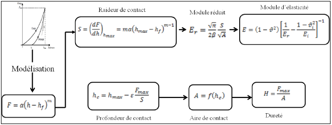 Puisque les profondeurs hmax et hr sont mesurables expérimentalement, il est alors facile, d’une part de calculer he (eq.13) et par la suite déterminer le module de Young à partir des relations (14) et (2) et d’autre part, d’obtenir l’aire de contact (eq.16 et 17) permettant d’évaluer la dureté du matériau.