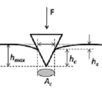 Au cours de l’indentation d’un échantillon, il peut y avoir une réponse élastique aux faibles charges, suivie de déformation élastoplastique aux charges plus élevées. On peut facilement admettre que si la charge Fmax, atteinte à une profondeur maximale hmax après un cycle total (charge-décharge) d’indentation, est réappliquée sur l’échantillon indenté, le matériau se déforme élastiquement avec une profondeur élastique he; lorsque la charge est enlevée, la même empreinte résiduelle du cycle précédent demeure avec une profondeur :