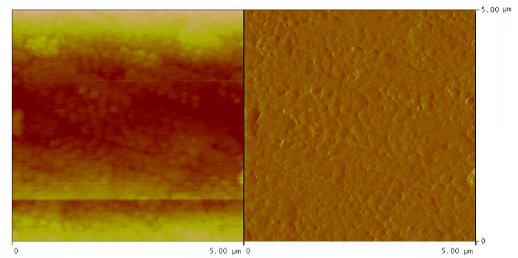 On remarque que la topographie de la couche est globalement uniforme avec la présence de dômes d’une densité de 1.753/μm². La couche comprend également des minuscules cratères répartis sur l’ensemble de la surface.