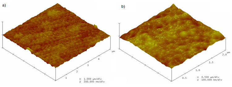 Figure III.13. Topographie de la couche WC observée en 3D, surface observée : a) 5μm², b) 2μm².