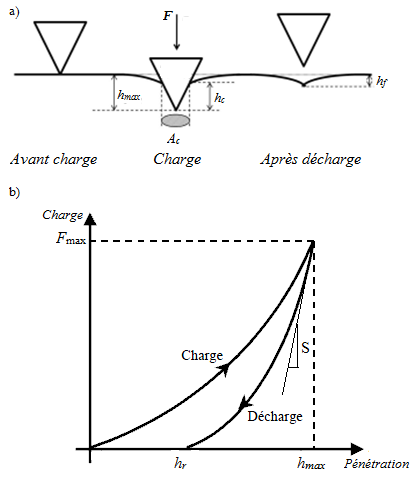 La courbe d’indentation présente deux parties distinctes. La première partie de charge correspond à l’enfoncement de la pointe d’indentation jusqu’à la pénétration maximale hmax, représentant à la fois les contributions élastique et plastique et ne peut donc pas être exploitée directement pour le calcul de la dureté. La deuxième partie de décharge représente le retrait de la pointe d’indentation en laissant une empreinte résiduelle de profondeur hf. La courbe de décharge représente la restitution élastique du matériau dont la pente initiale (au début de la décharge) présente la raideur de contact S.