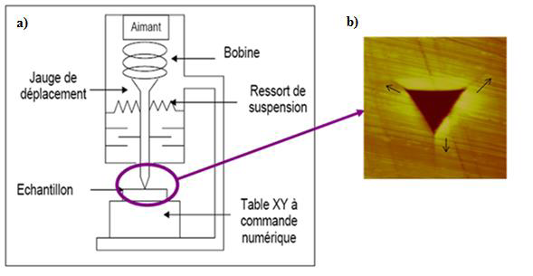 Figure III.1. a) Schéma du système de nanoindentation, b) empreinte d’indenteur Berkovich.