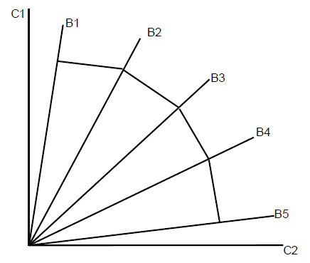 Les axes représentent les caractéristiques, chacune des droites (B1 à B5) représente un bien possédant les caractéristiques en rapport constant. Pour chaque bien est fixé un point, qui représente le rapport entre le revenu de l’individu et le prix du bien. La liaison de deux points (biens) entre eux est la frontière de caractéristiques(80).