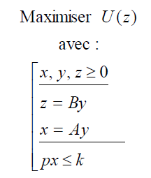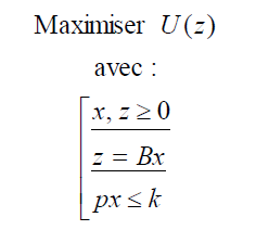 On note par r, m et n le nombre respectivement de caractéristiques, d’activités et de biens. On appelle U(z) la fonction d’utilité des caractéristiques, supposée convexe. On peut donc déjà indiquer que le choix du consommateur se résume à maximiser sous contrainte sa fonction d’utilité de caractéristiques(72).