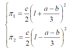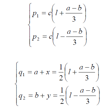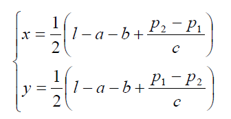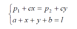 Dans ce système, on combine les contraintes de prix (égalité des prix totaux des biens au point de jonction) et de taille du marché. On peut en déduire les parts de marché des offreurs :