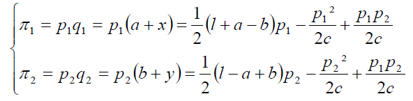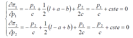 Si on remplace donc maintenant dans les équations de profit les valeurs des prix et des quantités par celles qui sont obtenues à l’équilibre, on obtient(62) :