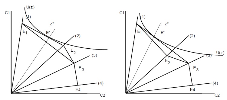 Sur le diagramme ci-dessous, le consommateur fait son choix sur la droite z*, en E*. Ceci représente un choix entre les deux bien (1) et (2). Lorsque le prix du bien (2) augmente suffisamment, le point E2 disparaît et est replacé sur la droite (2) au point E’2, qui représente un nouveau rapport entre le budget et le prix ajusté de ce bien. Le résultat se fait ressentir sur la droite de choix z*.