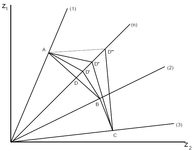 Si on considère les coefficients de la matrice comme fixes, nous pouvons alors résoudre le problème – même si tel n’est pas le but – sous la forme d’un programme linéaire. En prenant un modèle à deux caractéristiques et plusieurs biens, il est possible de conceptualiser plus clairement le système grâce à la figure suivante :