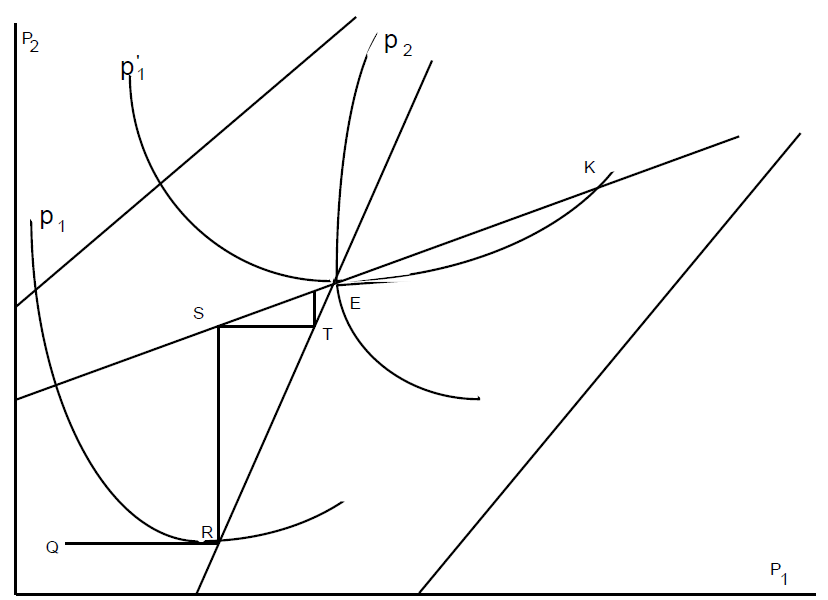 De ces résultats, l’auteur présente un graphique, ayant pour repère les prix des deux marchandises. Pour chaque offreur, les équations de courbe de profits représentent une famille d’hyperboles ayant une même asymptote oblique, les deux droites qui se croisent en E représentent les droites qui annulent les dérivées premières des équations de profit. Ainsi, la courbe qui croise l’axe des abscisses est celle qui maximise le profit de A; par exemple, si A se trouve dans la situation Q, où B a fixé son prix, il sera préférable pour A de fixer son prix en R, le point qui maximise son profit, en lui faisant obtenir un profit p1. A son tour, B réajustera son prix afin de maximiser son profit en fonction du prix de A pour atteindre S, et ainsi de suite. On aboutit à un équilibre en E où les deux offreurs obtiennent un profit maximum en fonction du prix de l’autre offreur (p1 et p2).