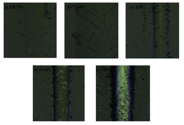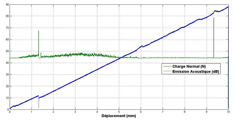 Un autre essai de microrayure a été réalisé au Centre d’Enseignement et de Recherche Arts et Métiers ParisTech de Lille avec un appareil de type « MTS » équipé d’un microscope optique, d’un système de détection de l’émission acoustique et d’un indenteur diamant Rockwell de rayon de pointe 200μm.