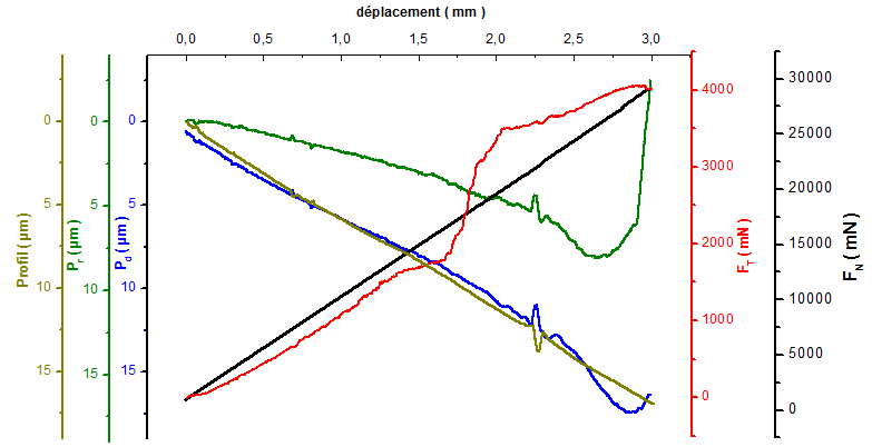 Les résultats obtenus présentent une imprécision des valeurs de force tangentielle et profondeur de pénétration dont les courbes sont très bruitées et ne seront donc pas utilisées dans la discussion.