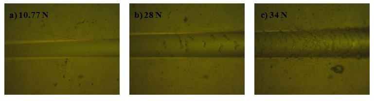 Figure IV.7. Micrographes optiques du comportement du revêtement WC durant le scratch test : a) fissuration du dépôt à 10.77 N, b) Écaillage avec fissuration du dépôt à 28N, c) rupture interfaciale du dépôt à 34N.