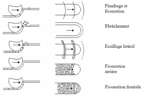Figure IV.2. Représentation schématique des modes de rupture des revêtements par micro rayage, vue de côté et de dessus [111].