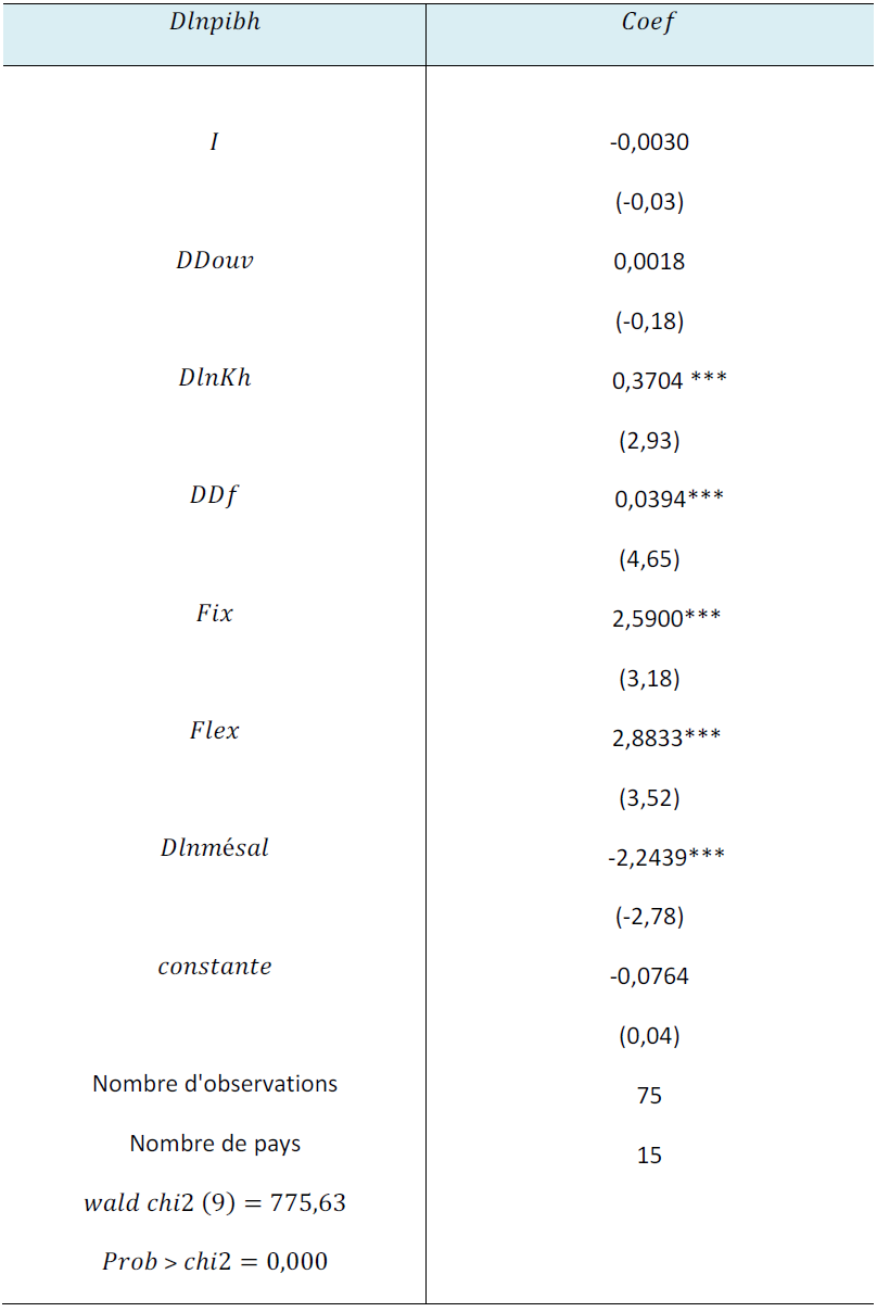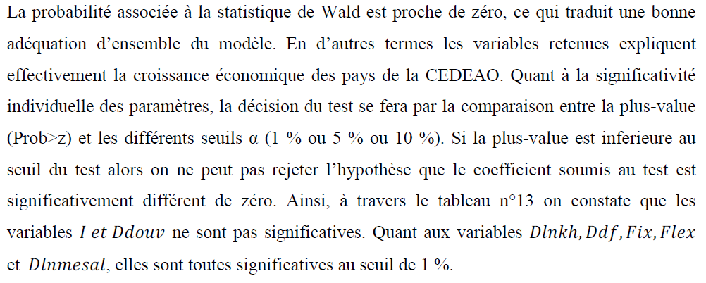 Les variables i et m ( l sont les seules qui ont un effet non significatif sur la croissance économique. Cette non significativité est probablement due au faible niveau des investissements et des degrés d’ouverture dans les pays de la zone.