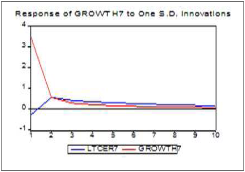 En outre, la décomposition de la variance indique que la variance de l’erreur de prévision de la croissance est due à 95 % à ses propres innovations et à 5 % à celles du TCER. La croissance économique du Ghana réagit négativement au choc du TCER et de manière spontanée jusqu’à la quatrième année et commence à se stabiliser à partir de l’année sept. La variance de l’erreur de prévision du taux de croissance de ce pays est due à 51 % à ses propres innovations et à 49 % à celles du TCER. Le taux de croissance de la Guinée a une réponse similaire que celui de la Gambie, à la différence que ce taux commence à se stabiliser à partir de la cinquième période. La variance de l’erreur de prévision du taux de croissance de la Guinée est due à 92 % à ses propres innovations et à 8% à celles du TCER. Quant au taux de croissance du Nigéria et de la Sierra Léone, leur réponse, suite à un choc positif sur les TCER est négative. Ces deux taux commencent à se stabiliser à partir de la septième période. La variance de l’erreur de prévision du taux de croissance économique du Nigeria est due à 93 % à ses propres innovations et à 7 % à celles du TCER. Pour la Sierra Leone, la décomposition de la variance indique que la variance de l’erreur de prévision de la croissance est due à 98 % à ses propres innovations et à 2 % à celles du TCER.