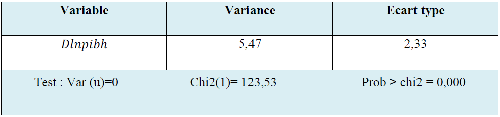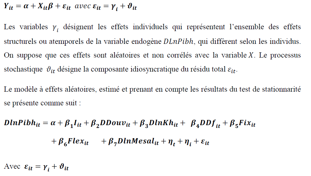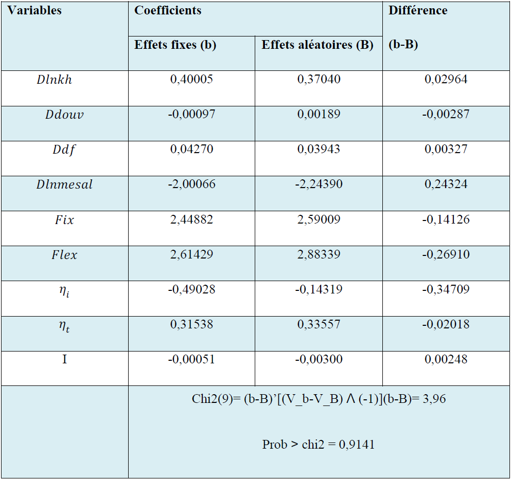 Le test de Hausman suit une loi de Khi-deux avec k-1 degré de liberté et permet de faire un choix entre le modèle à effets fixes et le modèle à effets aléatoires qui permettent de prendre en compte l’hétérogénéité des données. Dans le premier cas on suppose que les effets spécifiques peuvent être corrélés avec les variables explicatives du modèle, et dans le second cas on suppose que les effets spécifiques sont orthogonaux aux variables explicatives du modèle.