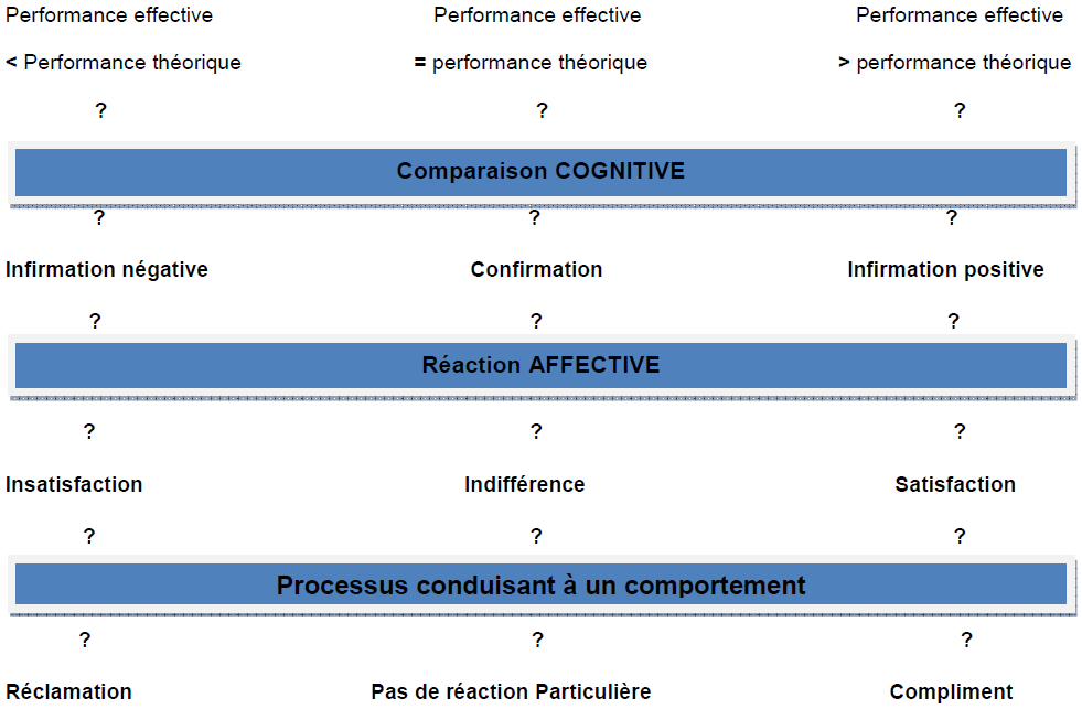 La recherche sur la mesure de la satisfaction s’est essentiellement structurée autour du paradigme de la confirmation des attentes. Ce dernier conceptualise la satisfaction à partir des trois notions que sont la comparaison, les attentes et les perceptions. Selon ce modèle, lorsque la qualité perçue est inférieure à la qualité attendue, il en résulte de l’insatisfaction. Au contraire, quand la qualité perçue est supérieure à la qualité attendue, le client ressent une forte satisfaction. Enfin, lorsque la qualité perçue est égale à la qualité attendue, le client éprouve une simple satisfaction (ce sentiment se situe dans une zone de normalité). Le paradigme de la confirmation des attentes est schématisé dans la figure suivante :