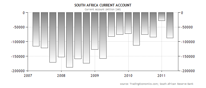 The South African Current Account is still negative but improving. When the same current account is compare to GDP is a bit lower than the equilibrium. Therefore, the balance of trade is almost equivalent to its current account balance, explaining that the negative portion representing the inflow (importations or FDI).