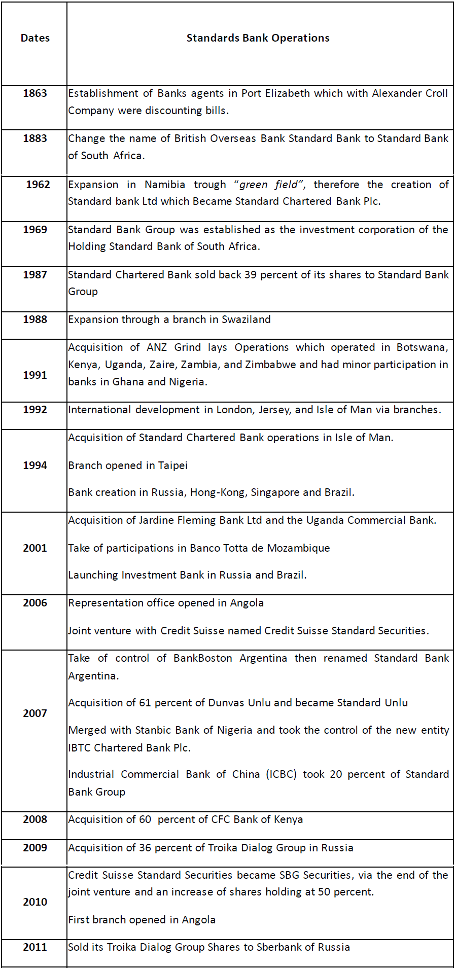 Standard Bank was founded in 1962 as affiliate of the British Overseas Bank(2) Standard Bank; its position is an expert in developing countries but international perspective. The bank was created in 1862 and started its operations in 1863 in London, with as principal activity to finance and participate on the development of the diamond fields in South Africa, but after many changing the overseas bank has become a merger leader in the continent and even in the world.