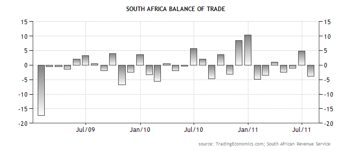 The South African Current Account is still negative but improving. When the same current account is compare to GDP is a bit lower than the equilibrium. Therefore, the balance of trade is almost equivalent to its current account balance, explaining that the negative portion representing the inflow (importations or FDI).