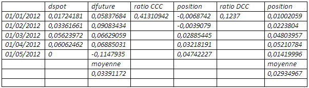 Avec les réalisations réelles des variations des prix spot et à terme du soja, la performance du ratio issu de la corrélation conditionnelle dynamique sur la corrélation conditionnelle constante se confirme. Bien que le prix au comptant du soja augmente, le taux de couverture de 41,31% enregistre une perte de -0,68% au mois de janvier 2012 sur la position résultante. Et à l’inverse, le ratio DCC ne procure que des gains en moyenne de 2,93%.
