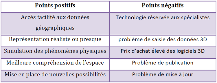 Il importe avant tout de souligner la nature particulière de cette technologie si l’on veut en comprendre l’impact sur le travail et l’emploi, sur la ville et ses acteurs. Cette nouvelle technologie ne fait pas exception ; il semble que certains limites et avancées marquent son univers. Nous présenterons dans le tableau récapitulatif suivant, et qui sera développé par la suite, dont l’objectif est de mettre en relief les différents points positifs et négatifs de la 3D comme outil au service des urbanistes dans la phase technique de leur projet.