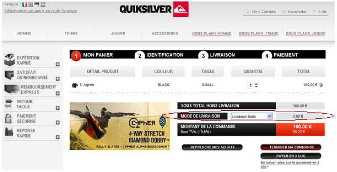 Figure 25. Prix de la livraison en point relais sur le site Quiksilver.fr en septembre 2011