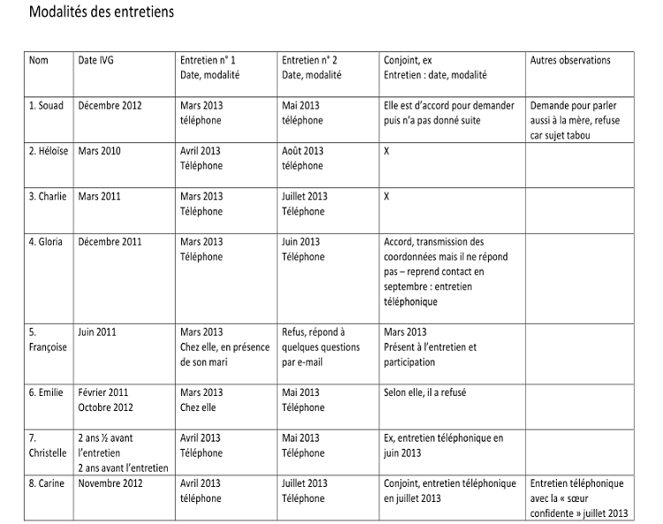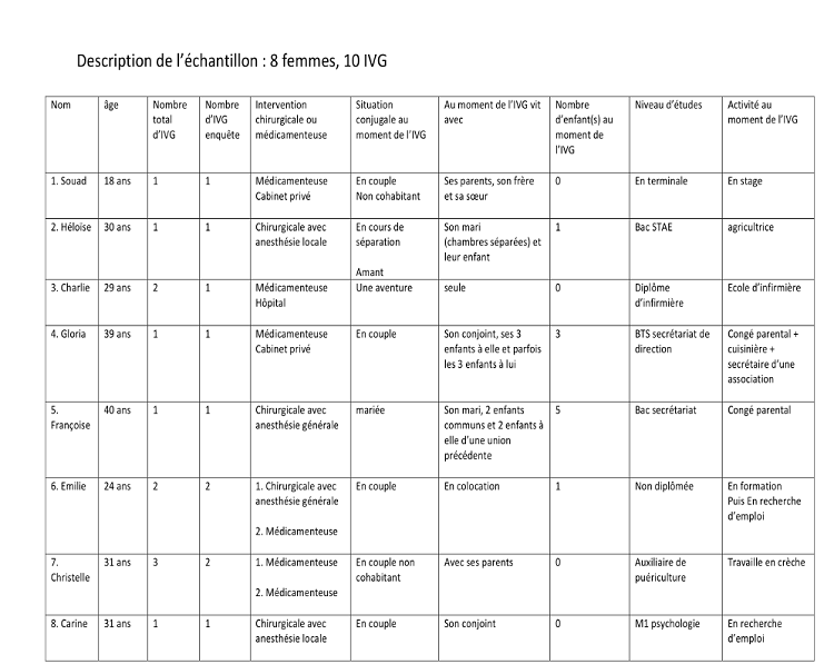 Au total, huit femmes ayant vécu une ou deux IVG dans les 3 dernières années (pour un total de 10 IVG) ont été interviewées. Un second entretien, bref, reprenant quelques points précis, a pu être réalisé dans la plupart des cas. Des entretiens ont également été menés avec quatre des hommes « coresponsables » de la grossesse interrompue, une soeur confidente et une conseillère conjugale et familiale dont le travail consiste à faire les entretiens pré-IVG dans un centre hospitalier.