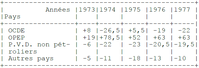 Comme il ressort du tableau ci-dessus, les PVD non membres de l’OPEP ont connu une forte dégradation de leur situation commerciale après la crise pétrolière : leur solde courant est passé de -6 en 1973 à -23 milliards de dollars américains en 1975.