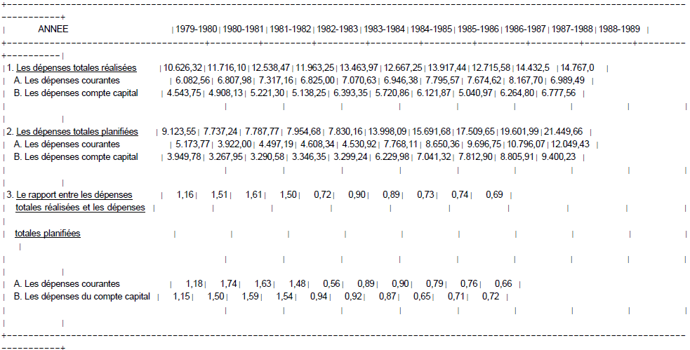 Ce tableau permet de constater qu’en moyenne pendant la période 1984-1989 (période d’ajustement budgétaire) le ratio entre le montant total des dépenses réalisées et les dépenses prévues a été de 0,80. Autrement dit, le montant des dépenses faites a été inférieur de 20 % à celui des dépenses prévues.