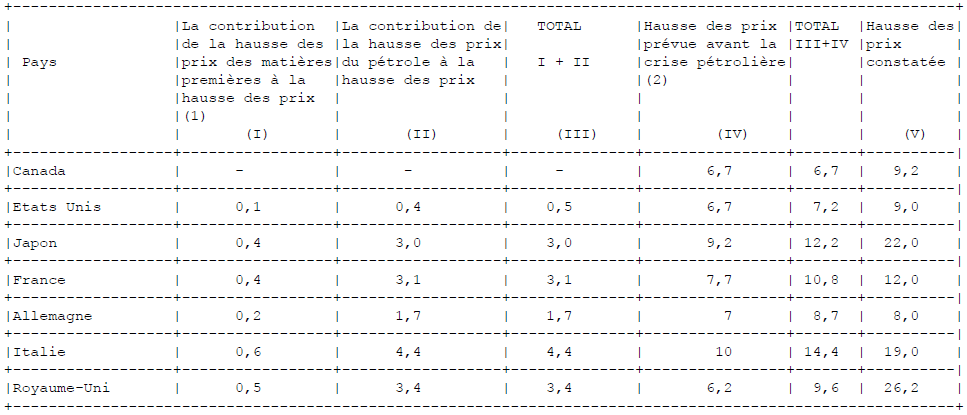 En outre, l’analyse du tableau ci-dessus montre que la hausse de prix observée en 1974-1975 a été beaucoup plus forte à cause de la hausse des prix du pétrole et d’un certain nombre d’éléments qui ont exercé un rôle amplificateur sur l’inflation. Parmi ces éléments, l’auteur évoque la poursuite de la hausse des coûts de salaire et l’explosion salariale dans certains pays.
