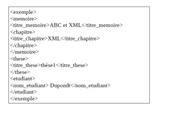 Notre exemple peut se représenter sous cette forme dans un document XML.
