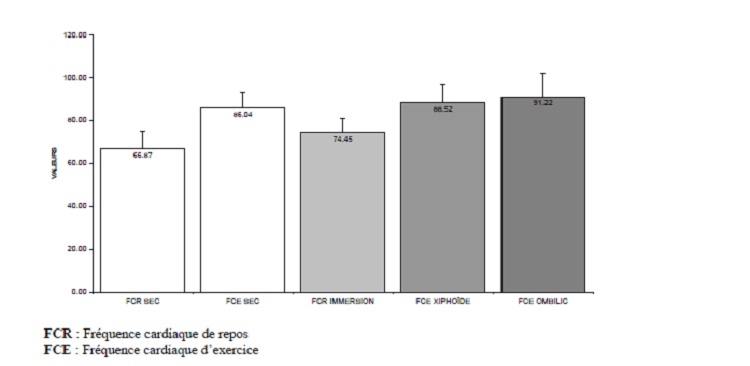 Figure 12. Comparaison des valeurs de fréquence cardiaque au repos et lors du test de marche selon les différentes modalités d’immersion