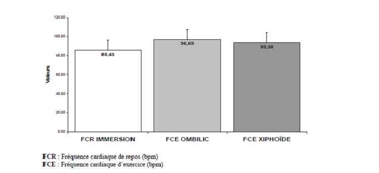 Figure 14. Comparaison des valeurs de fréquence cardiaque au repos et lors du test de marche selon les deux modalités d’immersion