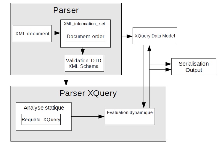 Notre décrivons de façon très simplifiée le processus de traitement de XQuery.